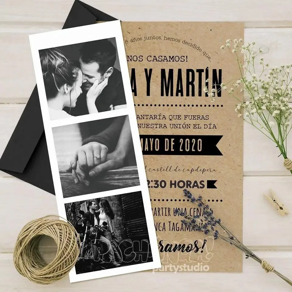 Incluye diseño (podemos cambiar la tipografía, el texto y naturalmente, las fotos), impresión en tamaño A5 en papel kraft, fotomatón y sobre simple (sin forro). Si quieres, puedes añadirle alguno de los extras que te detallo a continuación.