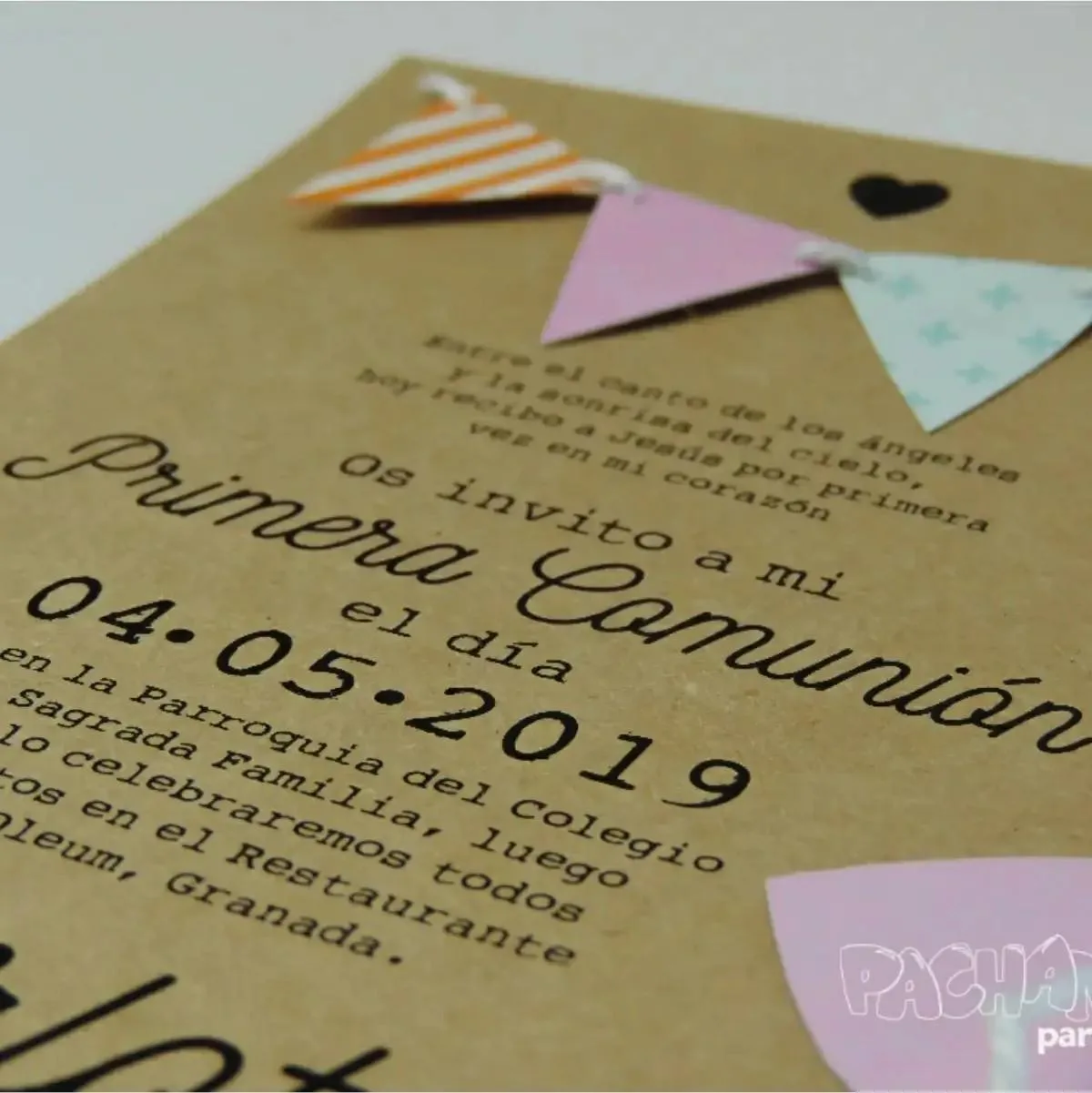Diseñé esta invitación para el bautizo de mi hija, en el 2014 y gustó tanto a todos que he decidido incorporarlo a la colección de comuniones y ¡qué decisión más acertada, ha sido un éxito total! El papel kraft le da un toque rústico que contrasta con la guirnalda de banderines que está cosida (con hilo y aguja, sí) una a una por mis manitas. Estoy segura que a ti también te encantará.