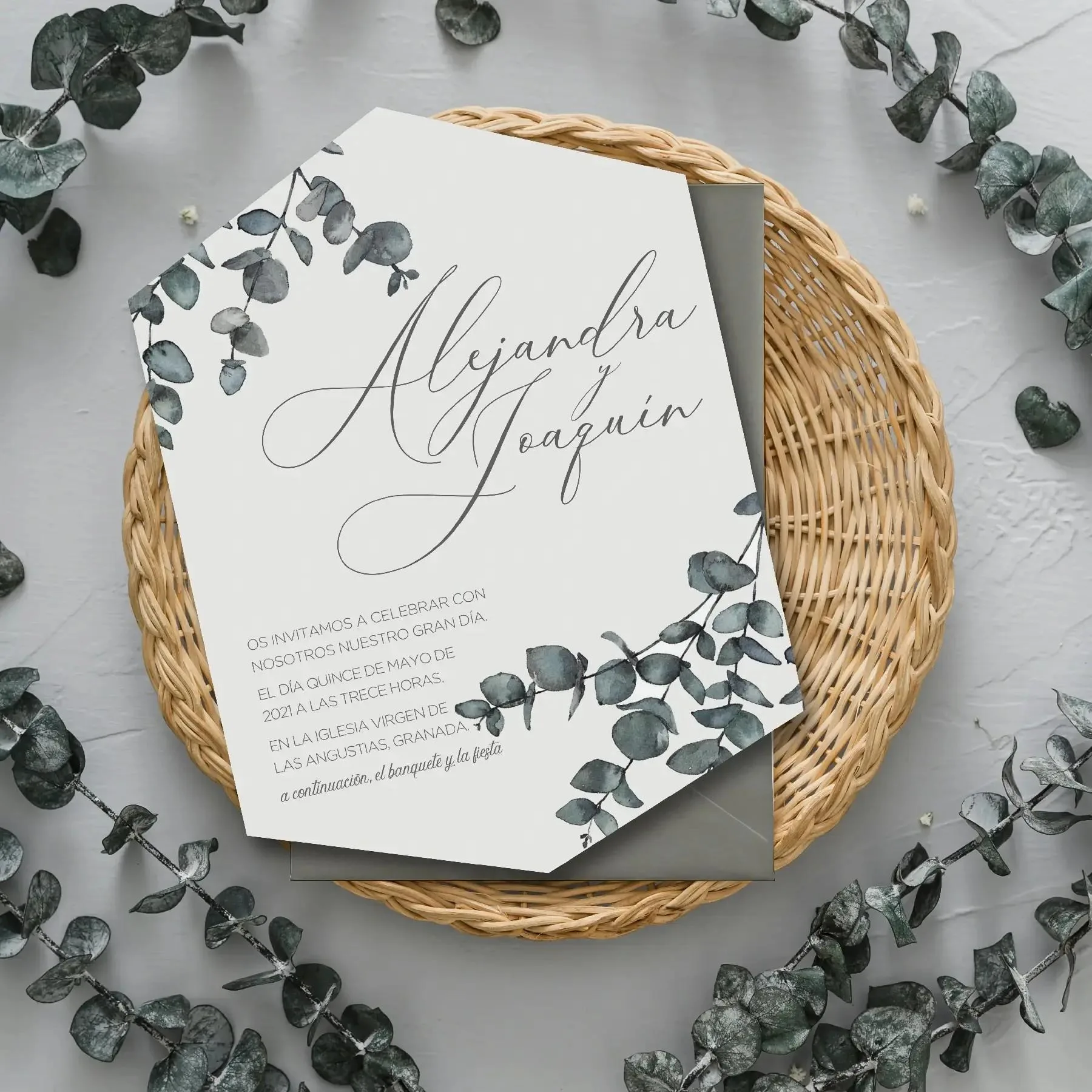 Incluye diseño (podemos cambiar la tipografía y el texto), impresión en tamaño A5 y sobre simple (sin forro). Si quieres, puedes añadirle alguno de los extras que te detallo a continuación.