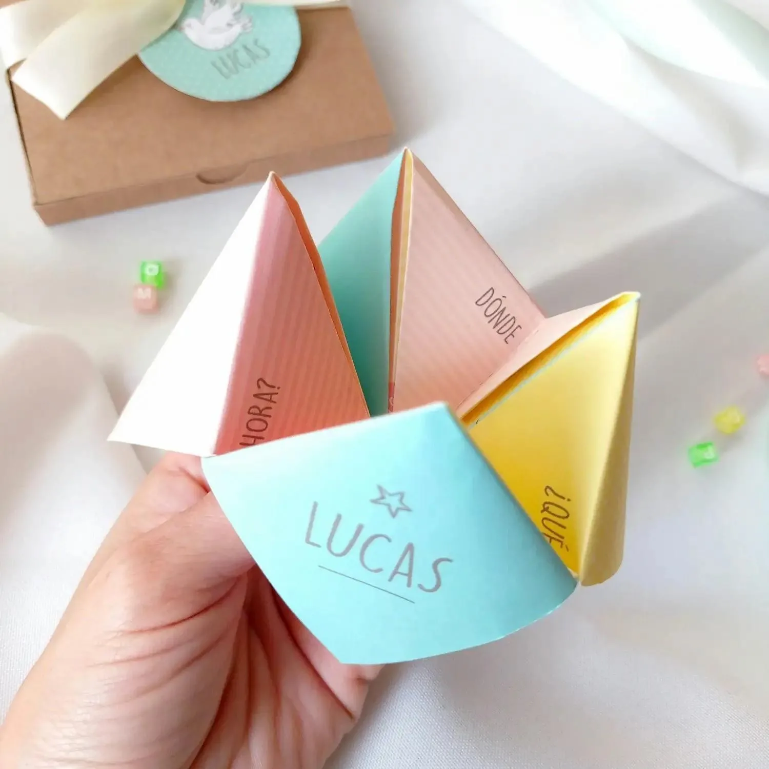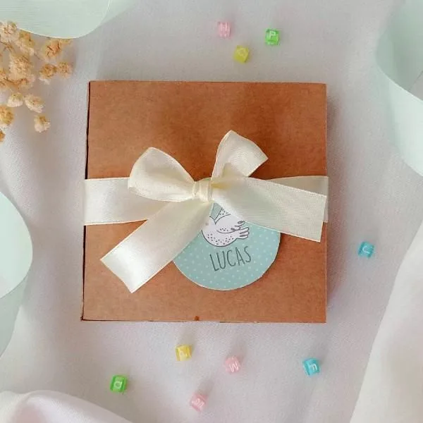 Incluye diseño (podemos cambiar la tipografía, color y el texto), impresión en tamaño 21×21 cm. (abierto), cajita, lazo y etiqueta a juego.