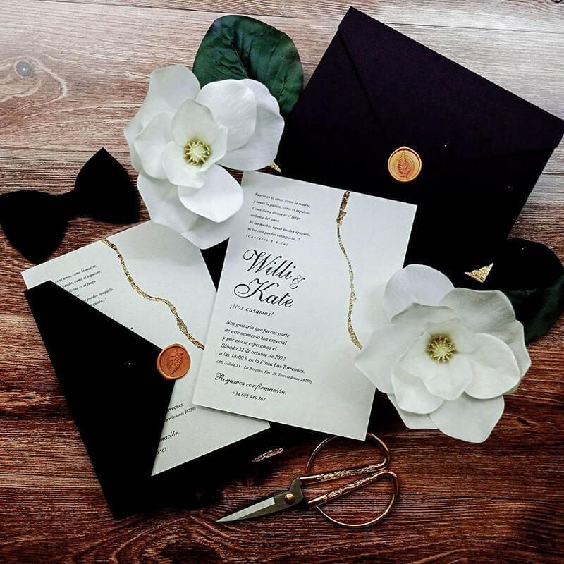 Incluye diseño (podemos cambiar la tipografía y el texto), impresión en tamaño A5, toques de pan de oro de imitación y sobre simple (sin forro). Si quieres, puedes añadirle alguno de los extras que te detallo a continuación.