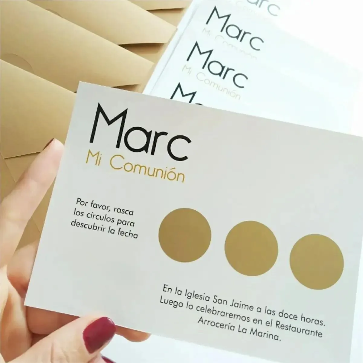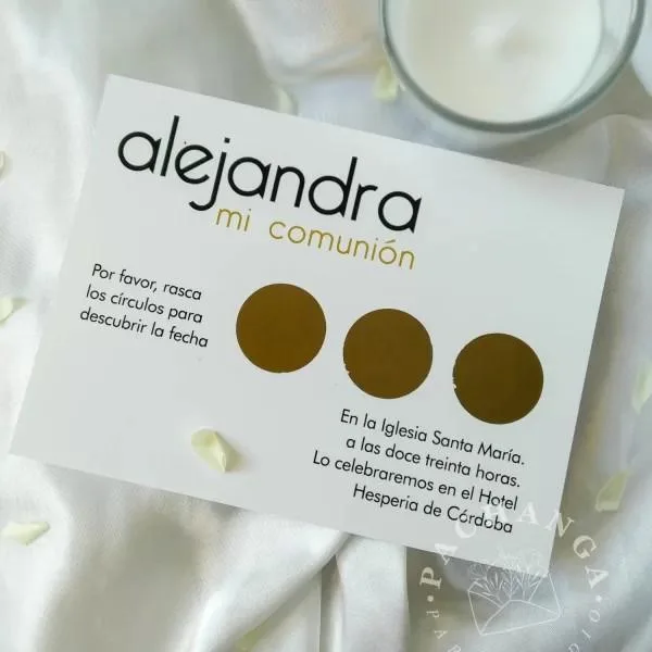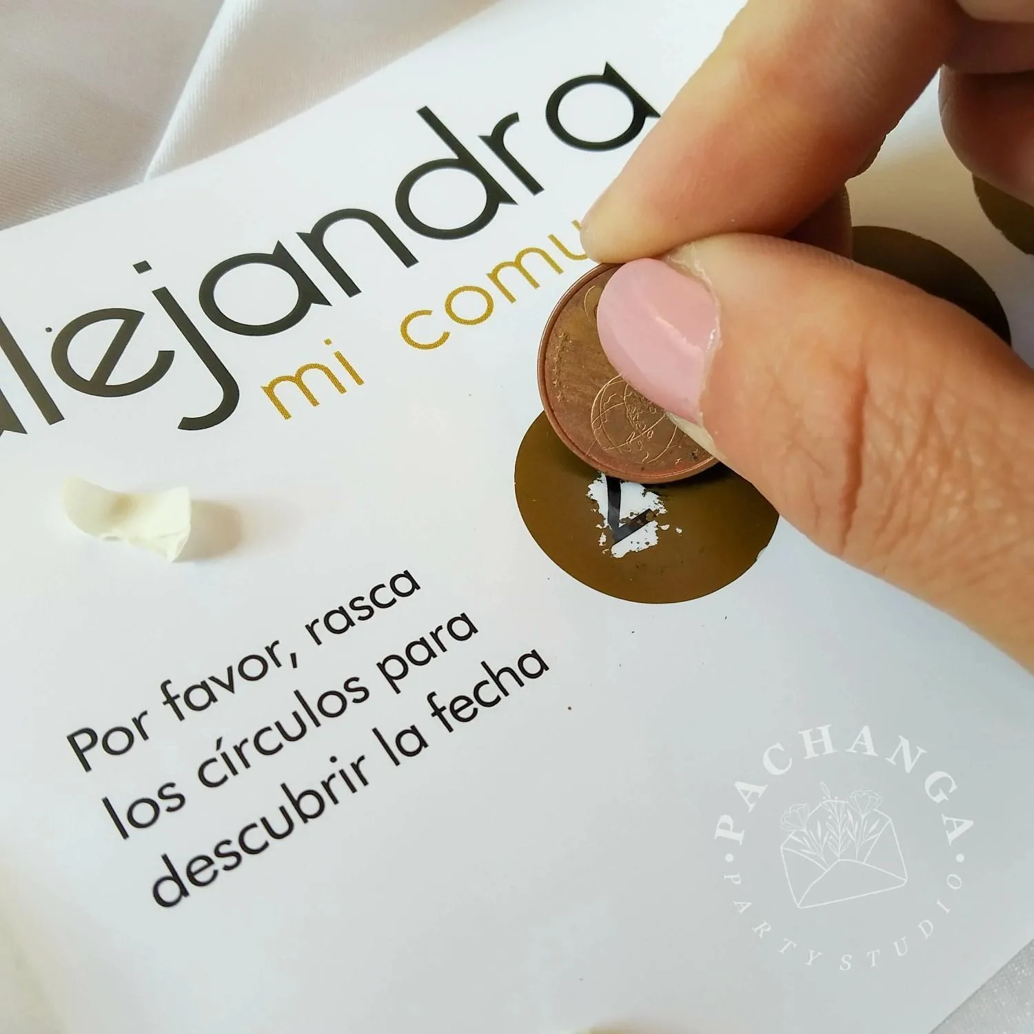 Deja que tus invitados se diviertan descubriendo la fecha de la comunión rascando los círculos y sorpréndelos con una invitación original que no olvidarán.